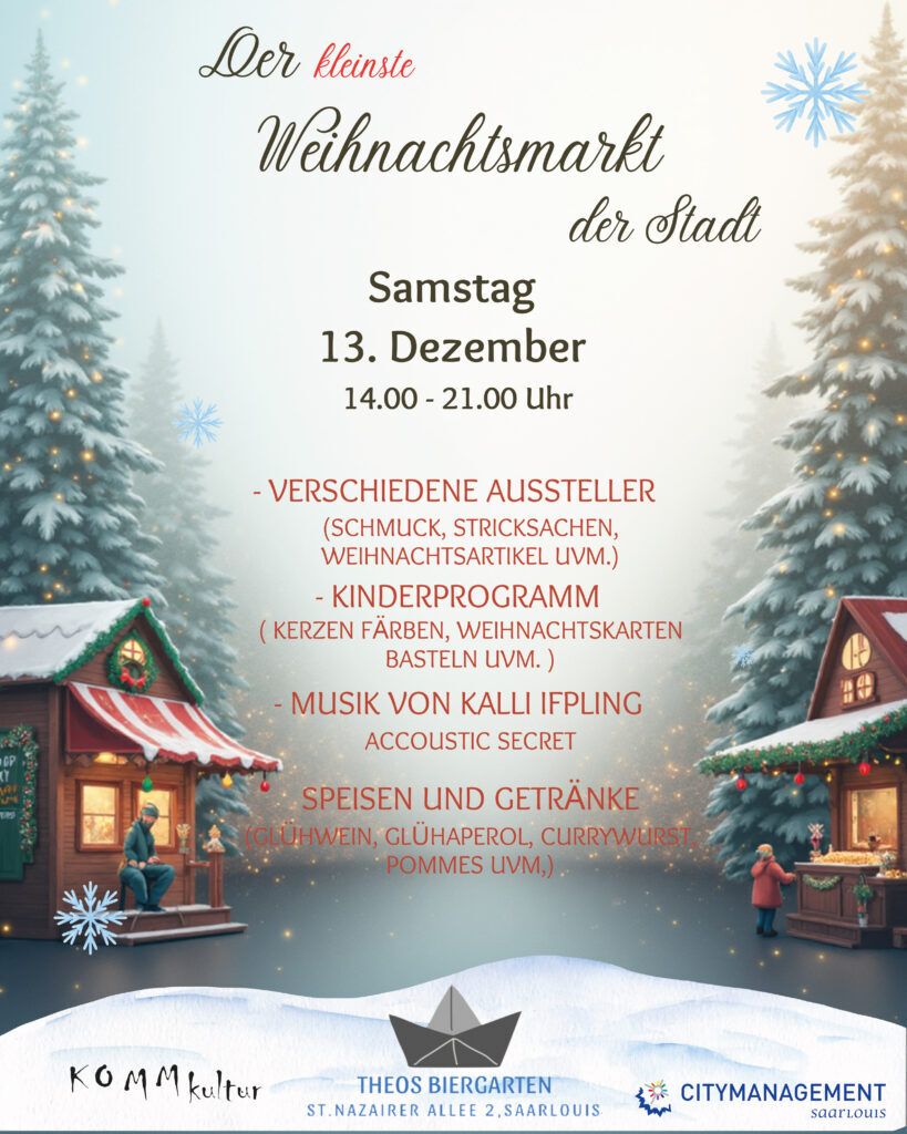 Am Donnerstag, 18. Dezember, von 11 bis 22 Uhr, ist der Verein KOMMkultur / SBS e.V. im gemeinnützigen Weihnachtshäuschen der Europastadt Saarlouis auf dem Weihnachtsmarkt am Kleinen Markt vertreten.